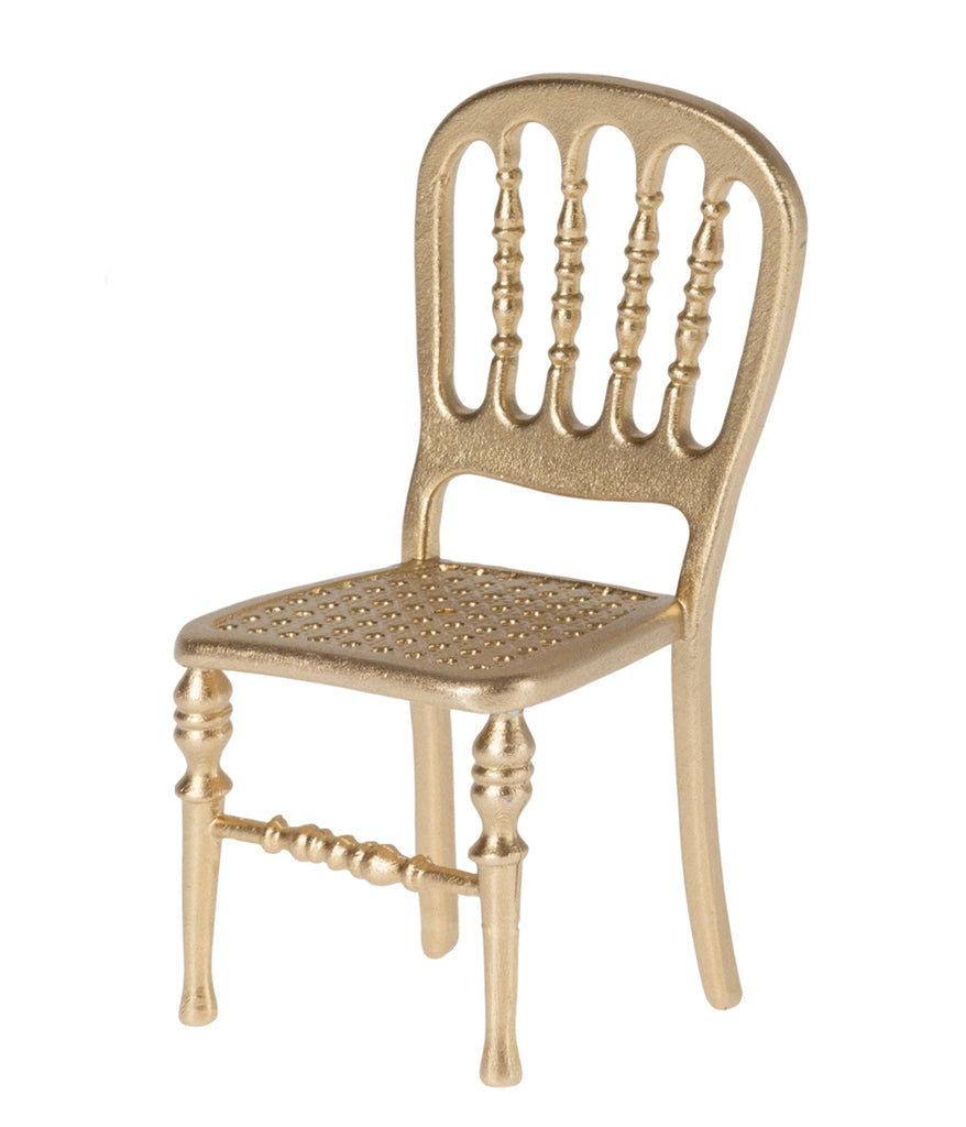A perfectly sized chair for any member of the Maileg Mice family. Made of metal with a golden finish. The chair fits together with tables in the mouse size.