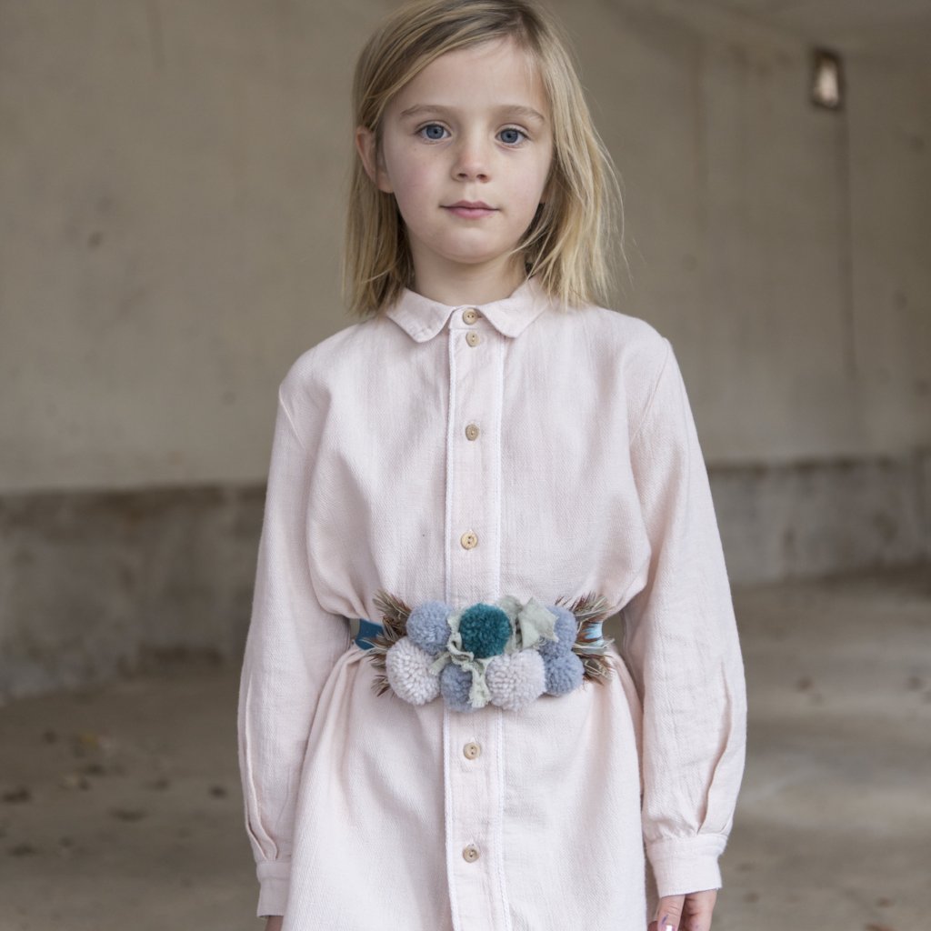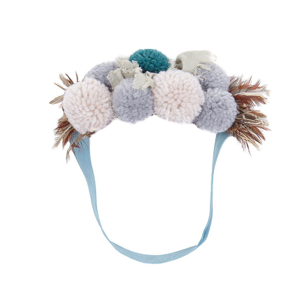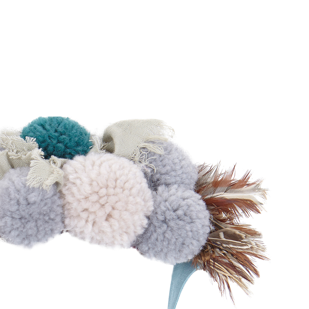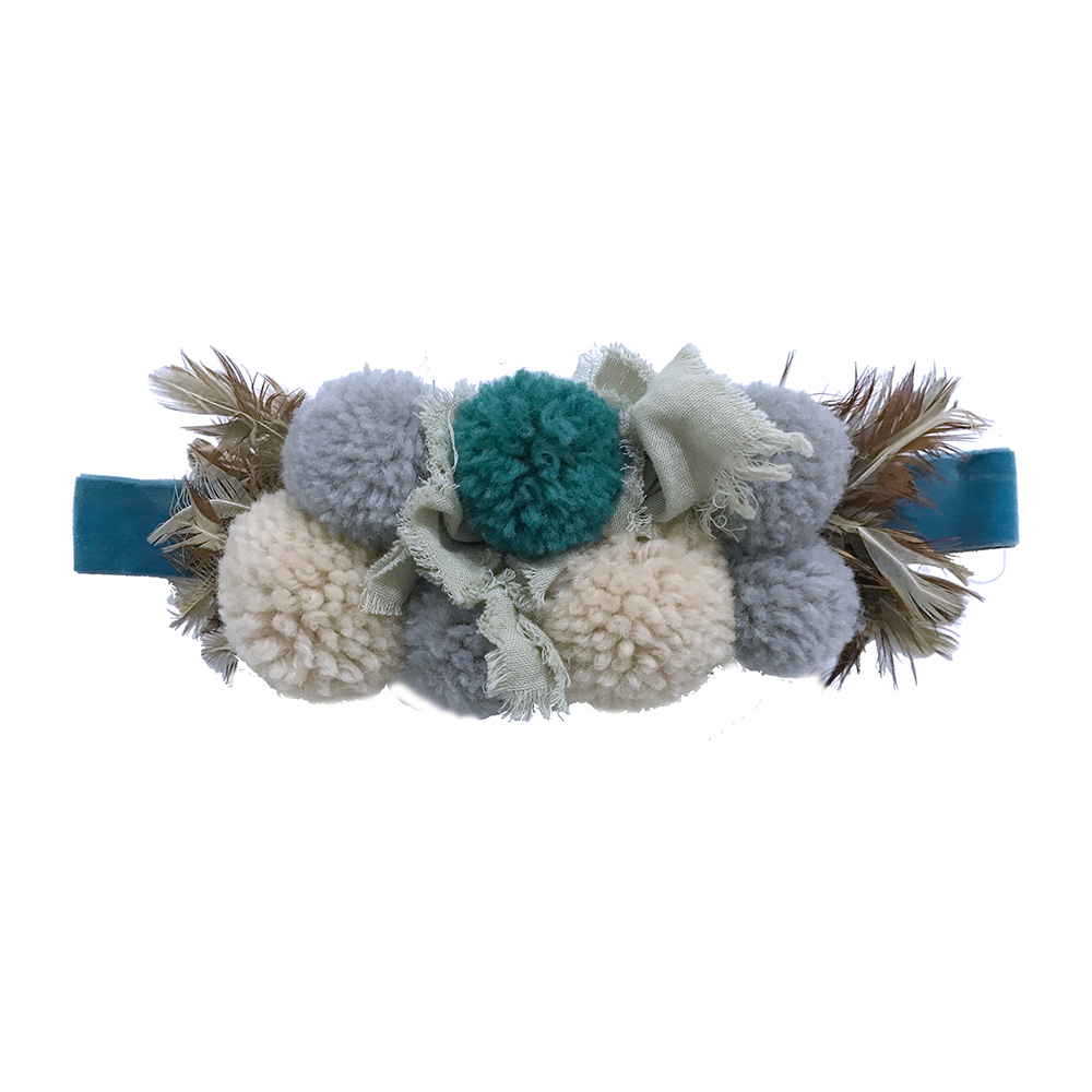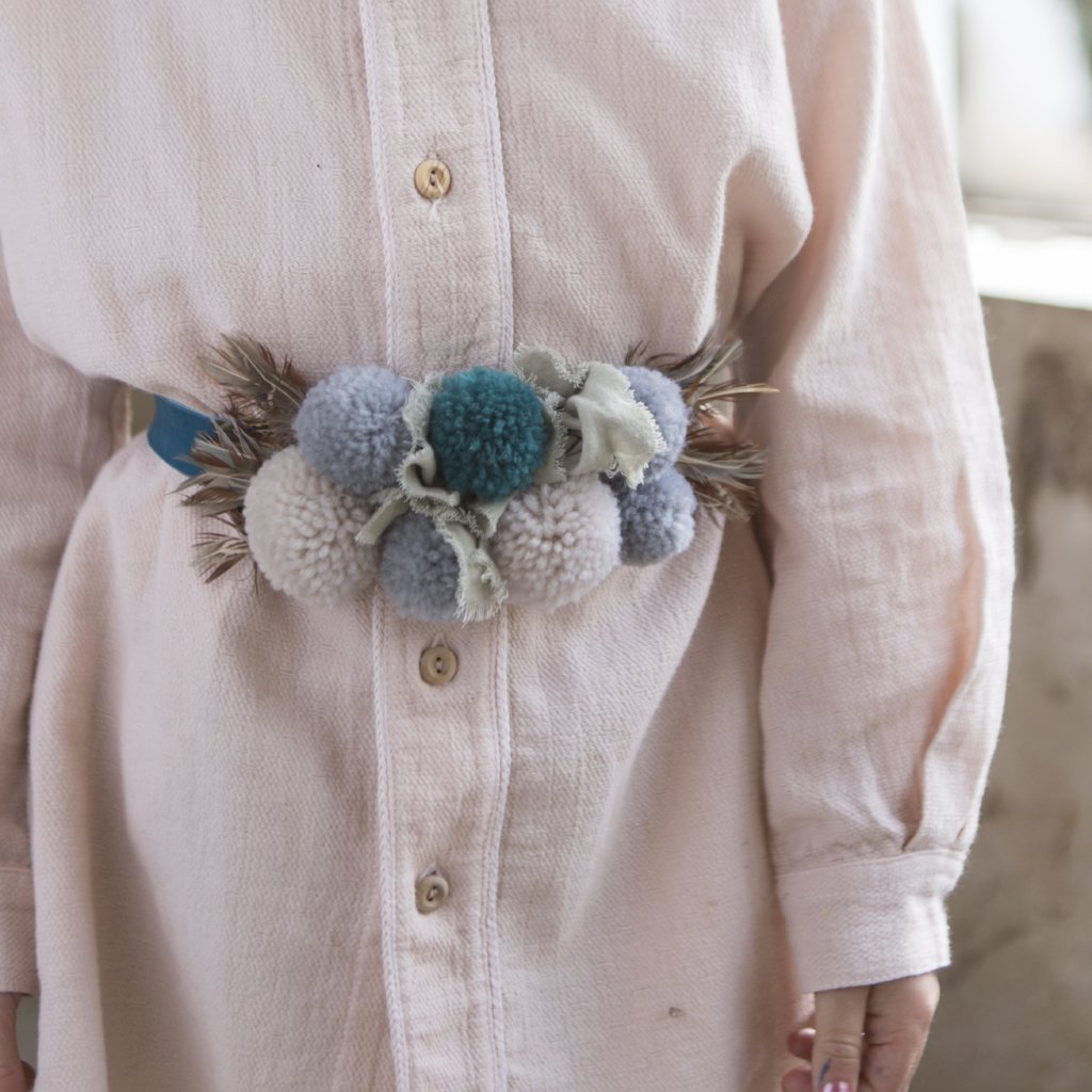 This is a beautiful and unique one of a kind piece with pompom, linen and feather details.  A beautiful addition to any outfit.  Can be worn as a headband or waistband over a dress or shirt.